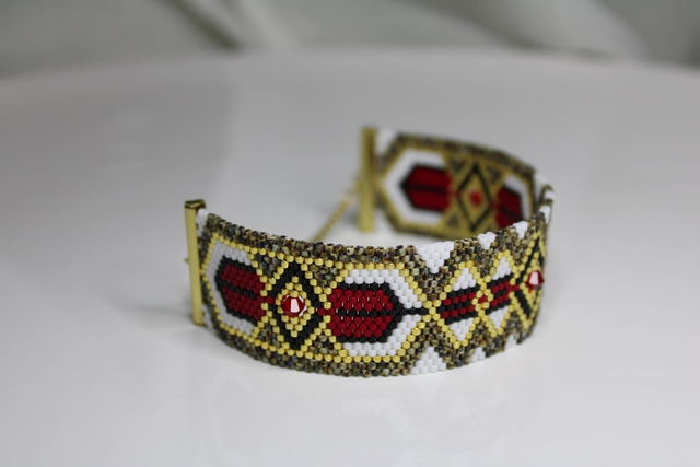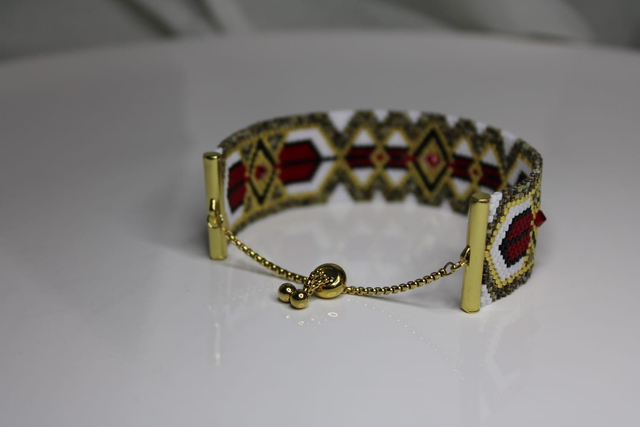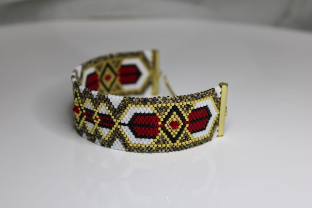 Je te présente une nouvelle version de ce bracelet, travaillée avec soin, avec ses Toupies en cristal et sa chaînette réglable vénitienne, un bracelet délicatement tissé à la main avec des perles Miyuki d’une finesse exceptionnelle. Son motif sophistiqué mêle des teintes riches de rouge, noir, or et blanc, évoquant la beauté intemporelle des saisons qui passent.